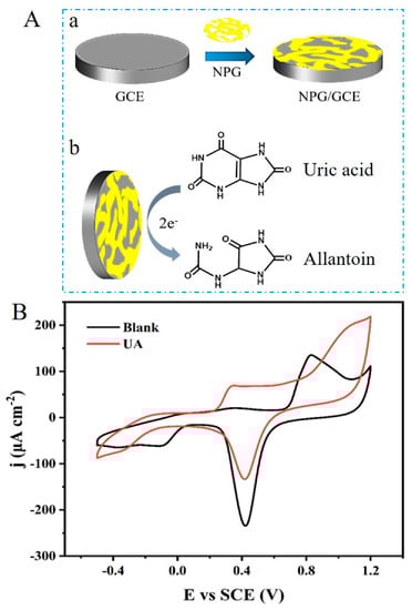 (A) Schematic diagram for the construction of NPG/GCE (a) and catalytic oxidation of uric acid by the NPG/GCE (b). (B) The CV curves of NPG/GCE in PBS (50 mM, pH 7.0) with and without 1.0 mM uric acid a scan rate of 50 mV s−1.