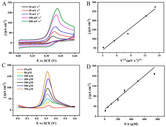 Based on the above results, the electrochemical oxidation behavior of uric acid at the surface of NPG/GCE was investigated by CV at different scan rates ranging from 10 mV s−1 to 200 mV s−1 in PBS (50 mM, pH 6.0) containing 1.0 mM uric acid. As shown in Figure 3A, the oxidation peak current density of uric acid gradually increased with the increase in the scan rate. According to the fitted curve in Figure 3B, a linear relationship was observed between the oxidation peak current density of uric acid and the square root of the scan rate, and the linear regression equation was: j (μA cm−2) = 20.17465 × V1/2 (mV1/2 s−1/2) − 20.94554, (R2 = 0.977). This result demonstrated that the electrochemical oxidation reaction of uric acid catalyzed by NPG was a diffusion-controlled type, which was consistent with the previous studies reported by Reddy et al. [46] and Abrori et al. [47].
