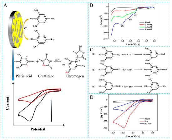 NPG/GCE was characterized in NaOH (0.2 M) solutions containing different concentrations (2.0 mM, 4.0 mM, 8.0 mM) of picric acid using the CV method. As shown in Figure 4B, As shown in Figure 4B, three obvious reduction peaks of picric acid around −0.8 V, −0.9 V, and −1.2 V were observed, respectively, which indicated the reduction reaction of picric acid on the surface of the NPG/GCE electrode occurred with electron transfer, generating obvious peak current signals. Moreover, the catalytic reaction of picric acid by NPG was a complex multi-step process, which involved three consecutive electron transfer processes in the reduction process according to a previous report [53]. The reaction mechanism is shown in Figure 4C. Firstly, three nitro groups in the picric acid molecule were reduced to nitroso with the participation of two electrons and two protons, respectively, as described in Equation (1). Then, the nitroso was further reduced to the hydroxylamine group with the participation of electrons and protons as shown in Equation (2). Finally, the hydroxylamine group continued to be reduced and produced an amino group (Equation (3)). Figure 4B showed that the peak current signals corresponding to the three reduction peaks increased with the increase in picric acid concentration, which indicated that the NPG/GCE had good catalytic activity for picric acid. To protect the electrode and reduce the CV detection time, the first reduction process of picric acid at −0.8 V was used in subsequent experiments to indirectly detect creatinine in a potential window from −0.9 V to −0.5 V.