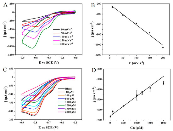 To investigate the electrochemical behavior of picric acid reduction at the surface of the NPG/GCE, the CV curves of the NPG/GCE were recorded by varying the scan rate from 10 to 200 mV s−1 in NaOH (0.2 M) containing 4.0 mM picric acid. As shown in Figure 5A, the reduction peak current density of picric acid at −0.8 V increased with the increasing scan rate. Figure 5B described that the reduction peak current density of picric acid was linearly related to the scan rate with a linear equation: j (μA cm−2) = − 4.01353 × V (mV s−1) − 209.12167. These results indicated that the catalytic reaction of picric acid by the NPG/GCE electrode was a surface-controlled type.