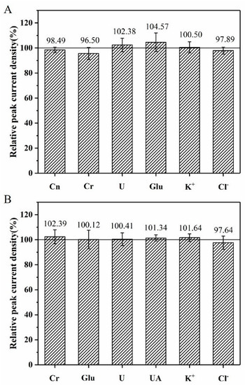 As one of the most important parameters to evaluate the detection performance of electrochemical sensors, the anti-interference ability of the NPG/GCE was investigated by recording the electrochemical response of uric acid in the presence of the common interferences in urine such as creatinine, creatine, urea, glucose, K+, and Cl−. Anti-interference studies were performed by adding 1.5 mM interferents individually into PBS (50 mM, pH 6.0) containing 300 μM uric acid. The relative peak current density values were calculated after the addition of different interferents, respectively. As shown in Figure 6A, there were no significant effects on the electrochemical response of uric acid catalyzed by the NPG/GCE electrode after the addition of interferents. The relative peak current density values ranged from 96.50% to 104.57%, indicating that these interferents did not affect the detection of uric acid by the NPG/GCE electrode and the NPG/GCE electrode exhibited good anti-interference capability.