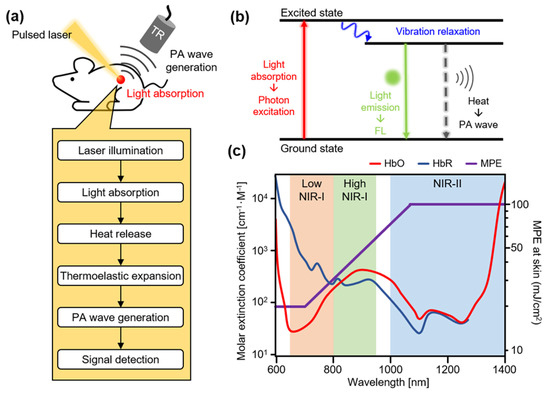 The light–tissue interactions during laser excitation in PAI are highly dependent on the wavelength of the light. During the initial stages of the development of PA imaging, an Nd:YAG pumped green laser (532 nm) was frequently used as an excitation source owing to the strong intrinsic absorption of blood in the visible region [67]. Visualization of the blood vessel network with visible light sources can provide useful information for investigating hemodynamics, but the strong PA signals of blood vessels may offset signals from other chromophores. Therefore, contrast agents for PAI that absorb laser light in the first near-infrared (NIR-I, 650–1000 nm) region have been developed, which exhibit relatively low interaction with tissue, enabling photons to penetrate deeper into the biological tissues (Figure 1c) [68,69]. Using widely available lasers in the NIR-I region, multispectral PA analyses were performed to evaluate the functionalities of the developed agents. However, oxy- and deoxyhemoglobins are major absorbers in the NIR-I region. Therefore, the light absorption of PA agents has recently been extended to the second near-infrared region (NIR-II, 1000–1700 nm). In this region, photons are significantly less scattered in biological tissues, which allows for an enhanced penetration depth [70]. PA imaging with NIR-II excitation is also advantageous owing to its higher MPE for skin [63]; thus, the resulting higher optical illumination can generate stronger PA signals.