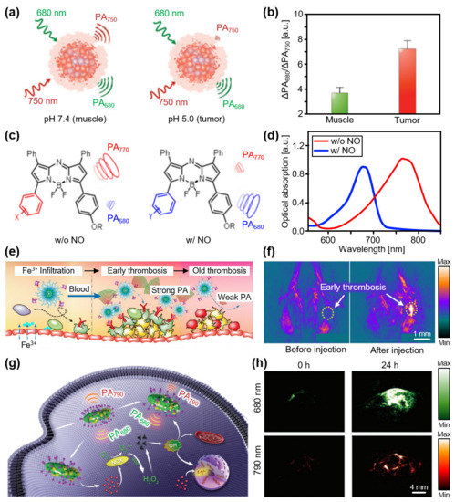 Semiconducting polymer nanoparticles (SPNs) have been developed as PA agents owing to their superior light absorption and photostability. In particular, organic semiconducting perylene diimide (PDI) was used because of its good chemical, thermal, and optical stability, as well as its good biocompatibility. Cui et al., developed PDI-based nanoparticles that could detect early thrombi [86]. They added cyclic Arg-Gly-Asp (cRGD) peptides, which have a high binding ability to glycoprotein IIb/IIIa generated from the early thrombus (Figure 2e). In the in vivo verification of the nanoparticles, the PA signals increased ~4.3-fold 24 h after injection at the early thrombosis sites in mice (Figure 2f). Yang et al., developed PDI-based nanoparticles that can act as theranostic platforms by generating reactive oxygen species (ROS) [87]. The synthesized nanoparticles release cisplatin in a tumor environment to activate nicotinamide adenine dinucleotide phosphate oxidase and trigger the conversion of oxygen to superoxide radicals, causing the generation of toxic hydroxyl radicals (Figure 2g). ROS generation by the proposed nanoparticle can be monitored using PAI owing to the strong light absorption of the ROS-sensitive molecules in nanoparticles. The resulting multispectral PA analysis showed an increase in the ratiometric PA signals of the U87MG xenograft tumor regions of mice in vivo. The PA signals at 680 nm were ~3.41-fold higher than the PA signals at 790 nm 24 h after injection, indicating the generation of ROS (Figure 2h).