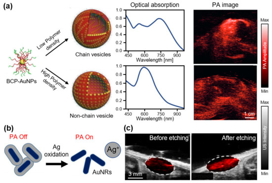 In addition to organic structures, inorganic nanoparticles have been synthesized owing to the possibility of easy surface modifications for drug loading or disease targeting. In particular, gold nanoparticles (AuNPs) have been extensively studied because of their exceptionally high optical absorption efficiency [88]. Jokerst et al., synthesized gold nanorods (AuNRs), with an optical absorption peak at 760 nm, for detecting ovarian cancer [89]. They achieved contrast-enhanced images of MDA-435S xenograft tumor regions of mice in vivo. To obtain strong PA signals, Liu et al., developed AuNPs with chain vesicles by combining them with a block copolymer (BCP) [90]. Owing to the strong optical absorption of the chain vesicles, the proposed AuNPs exhibited high PA signals at 780 nm (Figure 3a). Compared with AuNPs without chain vesicles, the proposed AuNPs yielded an ~8-fold signal enhancement after subcutaneous injection into mice. Activable AuNPs were also investigated via surface modification. For example, Kim et al., demonstrated that gold/silver hybrid nanoparticles react with bacterial infections [91]. Hybrid nanoparticles were coated with a silver layer that blocked the PA signals from the internal AuNRs (Figure 3b). When the ferricyanide solution was added to the nanoparticles, the silver coating peeled off, and the silver ions were released. Consequently, PA signals were revealed from the internal AuNRs, providing a strong contrast in the PA images at an excitation wavelength of 750 nm. The released silver ions exhibited a strong bactericidal efficacy (>99.99%). In vivo monitoring of mice was used to verify the silver ion release by comparing the PA signals before and after silver etching (Figure 3c).