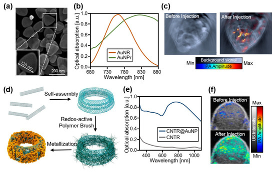The strong optical absorption characteristics of AuNPs have also been applied to the development of PA contrast agents in the high NIR-I region. Bao et al., developed a PEGylated gold nanoprism (AuNPr) for detecting gastrointestinal cancer (Figure 5a) [101]. The anisotropic shape of AuNPr provided a strong absorption at 830 nm, making it suitable for contrast-enhanced PAI (Figure 5b). They obtained multispectral PA images of HT-29 tumors in mice before and after the injection of AuNPr. After injection, the PA amplitude in the tumor region increased (Figure 5c). Song et al., introduced AuNP-coated carbon nanotube rings (CNTRs) with enhanced light absorption and photothermal effects (Figure 5d) [102]. The high plasmonic coupling in the developed CNTR produced significantly increased light absorption at 808 nm (Figure 5e). After intravenous injection of AuNP-coated CNTR into U87MG xenograft tumors in mice, much stronger PA signals were achieved compared with those after the injection of pure CNTR (Figure 5f). In addition to contrast-enhanced PAI, the treatment efficiency was evaluated with photothermal ablation.