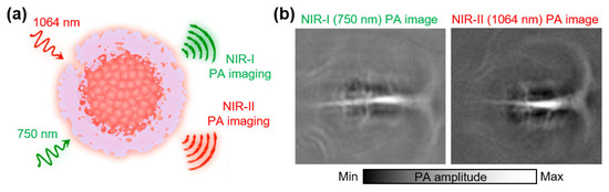 In PAI, endogenous chromophores that absorb light, such as oxy-hemoglobin, deoxy-hemoglobin, melanin, and lipids, can be used as contrast agents for visualizing physiological responses [45,46,47,48]. However, endogenous chromophores are limited to optically transparent organs, including tumors, the lymphatic system, and the bladder. In addition, two types of hemoglobin typically dominate all photoacoustic (PA) signals. Therefore, contrast-enhancing techniques using a variety of exogenous agents have been extensively studied, including organic dyes, gold nanoparticles, carbon nanostructures, semiconducting nanoparticles, and fluorescent proteins [49,50,51,52].
