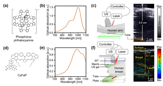 Organic dyes have also been found to possess NIR-II-absorbing capability. Zhou et al., reported phosphorous phthalocyanine with an absorption peak at ~1000 nm (Figure 7a) [107]. The developed phthalocyanine-based dye could be used as a PA contrast agent, with an excitation wavelength of 1064 nm, which was generated using commercial Nd:YAG lasers (Figure 7b). Contrast-enhanced PA images were obtained from chicken breast tissue in an exceptionally deep position (~11.6 cm). Notably, phthalocyanine-based dyes were successfully visualized through a human limb (~5 cm) with an energy of 23 mJ/cm2, which is much lower than the MPE at 1064 nm (Figure 7c). The same group, Chitgupi et al., developed a surfactant-stripped micelle with a commercially available cyanine fluoroalkyl phosphate (CyFaP) salt dye for higher NIR-II absorption (Figure 7d) [108]. The effectiveness of the developed micelles was verified at a depth of 12 cm in chicken breast tissue, with an SNR of 24.3 dB (Figure 7e). Similar to the previous human experiment, tubes containing surfactant-stripped CyFaPs were imaged through the breasts of human volunteers (Figure 7f). The resulting images showed a strong imaging capacity at a depth of 2.6–5.1 cm of human breast tissue at an excitation wavelength of 1064 nm and energy of 21 mJ/cm2. Park et al., demonstrated a nickel dithiolene-based dye as an NIR-II-absorbing molecule at 1064 nm [109]. Hydrophobic nickel dithiolene-based dyes were dispersed in a biological buffer with an FDA-approved poly(lactide-co-glycolide) polymer via the nanoprecipitation method. The maximum detectable penetration depth for this PA agent was ~5.1 cm, with an SNR of 10.2 dB, in chicken breast tissue. The potential of this PA agent in preclinical and clinical investigations was demonstrated by contrast-enhanced PAI of sentinel lymph nodes, the gastrointestinal tract, and bladders in rats.