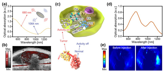 Inorganic nanoparticles have also been investigated as PA agents in the NIR-II region. These agents usually exhibit a better tunability of the bandgap for absorbing longer wavelengths of light. However, most of them have high aspect ratios, poor thermal stability, short blood circulation half-life, potential cytotoxicity, and systematic toxicity. Ku et al., reported the fabrication of copper sulfide nanoparticles with optical absorption at 990 nm as an inorganic NIR-II PA agent [110]. They demonstrated contrast-enhanced PA images of mouse brains using a 1064 nm Nd:YAG laser. Compared with copper, the high aspect ratio of AuNRs enables strong light absorption in the NIR-II range, as well as further tuning of the absorption spectra. Yim et al., demonstrated photostable NIR-II PA agents with a high aspect ratio (95 nm × 12 nm) in the form of AuNR-melanin hybrids (Figure 8a) [111]. The developed AuNR agents exhibited strong optical absorption over 1200 nm, which was used to generate PA signals with a laser excitation of 1064 nm (Figure 8b). Chen et al., reported a small, but high aspect ratio (50 nm × 8 nm) AuNR for NIR-II PAI [112]. This miniaturized AuNR could penetrate more easily into cancer cells and exhibited a high thermal stability compared with large AuNRs. They achieved contrast-enhanced PA images of tumors in mice with an approximately 4.5-fold signal improvement compared with large AuNRs. Zhou et al., reported another plasmonic AuNP that broadly absorbs light between 400 and 1300 nm [113]. The nanostructure was coated with methoxy PEG thiol and polydopamine to ensure structural integrity. Recently, an activatable NIR-II PA agent was developed using the polyoxometalate feature of molybdenum oxide (MoO3 (Mo5+/Mo6+)) (Figure 8c) [114]. The NIR-II absorbance of the MoO3 nanoparticles significantly increased when a portion of Mo6+ was reduced to Mo5+ (Figure 8d). Colon cancer tissues possess a high concentration of hydrogen sulfide (H2S), which reduces the oxidation state of MoO3 nanoparticles and eventually increases the PA signal of the tumor site. They demonstrated that endogenous H2S-activated NIR-II PA imaging could be employed on a tumor-xenografted mouse model (Figure 8e).