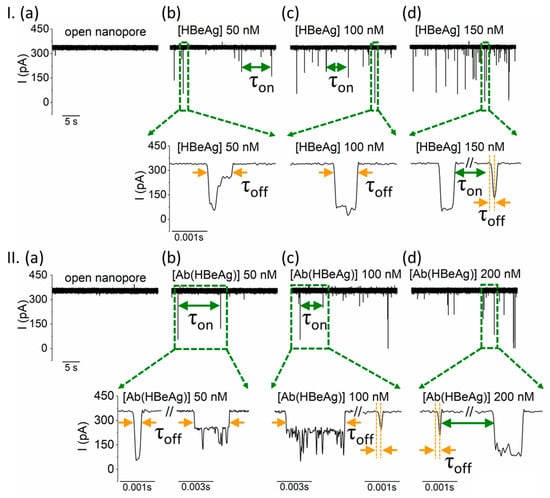 Despite their relative large size, the interactions between the cis-side-added HBeAg and Ab(HBeAg) with the α-HL nanopore are visible in electrophysiology experiments. (I) Reversible collisional interactions between the positively biased α-HL (a) and the cis-side-added HBeAg, present at 50 nM (b), 100 nM (c), and 150 nM (d) are seen as downwardly oriented spikes. The expanded traces illustrate the degree of heterogeneity of the blockade events, suggestive of geometrical re-orientations or/and structural changes of the captured analyte during individual bumping events. (II) The ionic current through a positively biased nanopore (a) is transiently blocked when the monoclonal antibody Ab(HBeAg) is added on the cis side of the chamber at incremental concentrations of 50 nM (b), 100 nM (c), and 200 nM (d), as a result of transient occlusions of the vestibule entrance of the nanopore during collisions. As presented in the expanded traces, the rich diversity of blockade substates manifested during individual collisional events, all characterized by various τoff values, supports the hypothesis of a highly dynamic state of the transiently captured antibody in terms of orientation and/or tertiary structure, all leading to various degrees of nanopore occlusion. The traces were recorded at an applied potential ΔV = +180mV in a 2 M KCl electrolyte solution, buffered at pH = 8 with a 10 mM HEPES solution.