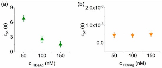 To further assess our technique’s ability to successfully detect HBeAg proteins, we statistically analyzed such interactions with the nanopore by means of the average blockade duration (τoff) and that measured between consecutive blockade events (τon) (Figure 3). To this end, complications arose from two main sources: (i) Unlike situations whereby smaller analytes are captured inside the nanopore and translocation, thus generating reproducible events in terms of relative current blockade. The events statistics in the present case are complicated due to the emergence of multiple classes of current blockade signals (Figure 2). As suggested, the broadening of the signal distributions in terms of blockade amplitudes most likely reflects orientation effects related to the relative position of the incoming proteins to the nanopore vestibule entrance during temporary binding events. (ii) Rapid blockades, comparable to the rise time of the low-pass filter used in the experiments (, where = 10 kHz) were prone to distortion by the limited bandwidth (0, ) of the amplifier.