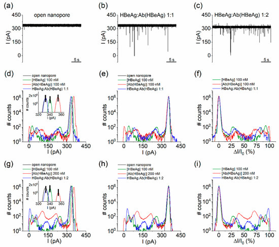 Starting from experiments carried out as displayed in Figure 2, in which the interaction of the cis-side-added purified HBeAg (100 nM) with the nanopore was evidenced, subsequent incremental addition of the Ab(HBeAg) to achieve concentrations of 100 and 200 nM, respectively, in a recording solution, led to the appearance of new blockage peaks on the recorded signal (Figure 4d,g, blue lines), distinct from the individual blockage distribution recorded when either the Ag(HBe) or the Ab(HBeAg) was present alone in the buffer (Figure 2). To eliminate the contribution of statistical variability of the ionic current through the open nanopore to the effects seen with the reagents added (readily visible in the insets of Figure 4d,g), all points histograms were manually shifted so as to precisely superimpose the peaks corresponding to open pore current distributions. This allowed us to compare the position of the relative current blockade peak maxima (), and accurately pinpoint the essential differences in the ensuing conductance fluctuations of the nanopore in the absence of (open pore), and, respectively, successive additions of the HBeAg, Ab(HBeAg), or HBeAg–Ab(HBeAg) complexes.