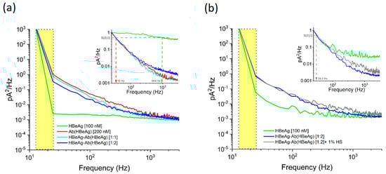 The noise analysis of collisional events ensued by proteins interacting with the α-HL nanopore (a) Representative power-spectra of the ionic current fluctuations recorded at ΔV = +180 mV, associated with the HbeAg, Ab(HBeAg), or HbeAg–Ab(HBeAg) complex collisions with a single α-HL nanopore. (b) The power spectrum of current fluctuations induced by HbeAg–Ab(HBeAg) complexes interacting with the α-HL nanopore remained unaltered in the presence of 1% human serum (HS). The yellow domains represent the frequency bandwidth containing excessive low-frequency noise contributions, subsequently excluded from the analysis (see also main text).