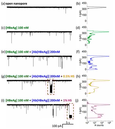 HbeAg–Ab(HBeAg) complex detections with a single α-HL nanopore in the presence of human serum proteins. Representative, original traces and related all-points histograms of the ionic current measured at ΔV = +180 mV across an open nanopore (a,b), then in the presence of cis-added Ag(HBe) antigen (100 nM) (c,d), followed by addition of the Ab(HBe) antibody (200 nM) (e,f), and subsequent pipetting of human serum (HS) at a 0.5% (v/v) (g,h) and, respectively, 1% (v/v) concentration (i,j). In certain cases, the HS addition led to the non-specific occlusion of the nanopore (red rectangle in panels (g,i), followed in certain cases by lipid membrane rupture.