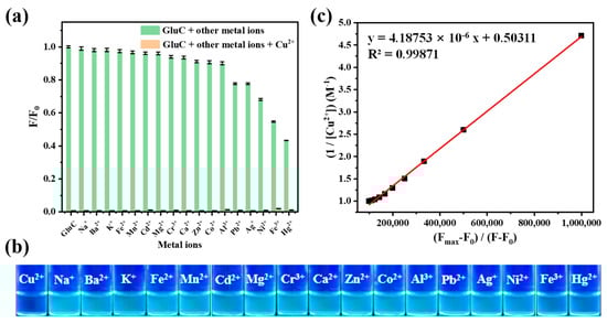 (a) The influence of different metal ions (20.0 μM) to fluorescence intensity of GluC (10.0 μM) at 494 nm followed by adding Cu2+ (20.0 μM) in water (n = 3, “n” means number of experiment repeats); (b) Visible color changes of GluC (10.0 μM) under UV light (365 nm) when adding various metal ions (20.0 μM); (c) The Benesi-Hilderbrand plots of GluC with Cu2+.