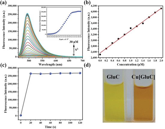 The spectroscopic responses of Cu[GluC] towards S2− were studied. As shown in Figure 2a, the fluorescence intensity of Cu[GluC] gradually increased with the addition of S2− and reached the plateau after adding 2.0 equiv of S2−. Fluorescence intensity shows a good linear relationship (R2 = 0.9941) towards the concentration of S2− ranging from 0–2 μM, according to which, the LOD and LOQ were calculated to be 49.6 nM and 165.3 nM, respectively (Figure 2b). Compared with other fluorescent probes [23,24,25,26], Cu[GluC] has a lower detection limit, indicating that Cu[GluC] has a sensitive detection ability toward S2− in water. The fluorescence responsive speed of Cu[GluC] (10.0 μM) towards S2− (30.0 μM) in water was further tested. As shown in Figure 2c, after adding S2− into aqueous solutions of Cu[GluC], the fluorescent intensity of Cu[GluC] increased quickly and reached the plateau within 20 s, which is faster than other S2− fluorescent probes [23,27,28,29], suggesting the quick S2− detection ability of Cu[GluC].