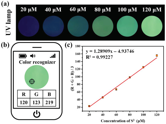 (a) Color changes of fluorescent test strips prepared by filter papers embedded with Cu[GluC] after treated with different concentrations of S2− aqueous solution under UV lamp (365 nm) irradiation; (b) The RGB values of fluorescent test strips were obtained through a smartphone app; (c) The linear relationship of (R+G+B)/3 values of fluorescent test strips relative to the concentrations of S2− (n = 3).