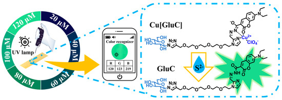 Carbohydrates are abundant biological molecules in nature with good water solubility and biocompatibility. They are widely used in the modification of drugs, probes and biomaterials to enhance their water solubility [17,18,19,20,21]. Introducing carbohydrates may be a good choice for improving the water solubility of S2− fluorescent probes. Here, we found that our previously developed glycosylated fluorescent bioprobe Cu[GluC] can achieve S2− detection in water with a low detection limit. The fluorescence of Cu[GluC] can recover quickly within a few seconds when encountering S2− in water based on the metal ion displacement strategy. Fluorescent test strips produced by Cu[GluC] displayed obvious color changes under 365 nm UV light after dropping S2− aqueous solution with different concentrations, which can achieve simply S2− detection by coupling with a UV lamp and a color recognizer app in a smartphone (Scheme 1). It is important to emphasize that this bioprobe Cu[GluC] and its derived fluorescent test strips realize convenient and sensitive S2− detection in water, which shows application prospects for water quality monitoring. To the best of our knowledge, enhancing water solubility of the fluorescent probe by introducing a glucose unit for the detection of S2− has not been reported yet.