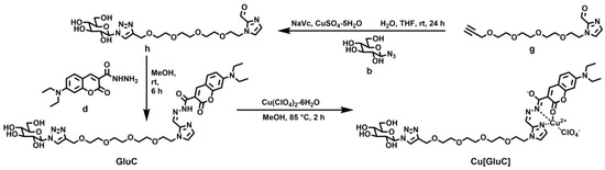 As shown in Scheme 2, compound g reacted with compound b to obtain compound h through a ‘click’ reaction and compound h reacted with compound d to obtain GluC through a Schiff base reaction. Finally, GluC reacted with Cu(ClO4)2·6H2O to obtain Cu[GluC]. The detailed synthesis route was provided in Supplementary Material according to our previous study [22] with some changes. 1H NMR and HRMS of the synthesized compounds were provided in Figures S1–S10.