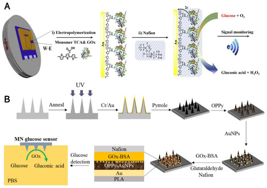 (A) Schematic representation of the reaction mechanism for pTCA was employed to stable immobilize GOx onto the electrode surface, “Reprinted with permission from Ref. [92]. 2019, Elsevier”; (B) The fabrication process of Nafion/GOx/AuNPs/OPPy/AuMNs array EC glucose sensor, layer by layer structure, and the glucose monitoring scheme in PBS, “reprinted with permission from Ref. [93]. 2020, Elsevier”.