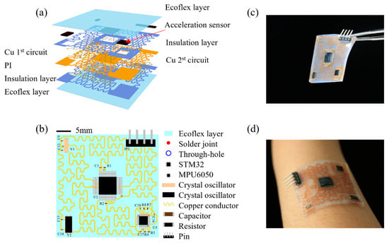 The schematic exploded view illustration of the flexible acceleration sensor is shown in Figure 1a, and the two-dimensional schematic diagram of the flexible accelerometer is given in Figure 1b. The device (length, ~35 mm, width, ~35 mm) is composed of serpentine copper (Cu) conductor (thickness, ~18 μm, width, ~254 μm) on a polyimide (PI) substrate layer (thickness, ~30 μm, width, 654 μm) that used to connect major components including MPU6050, STM 32, capacitor, resistor, crystal oscillator and pin, PI insulation layer (thickness, 20 μm), and Ecoflex encapsulation layer (thickness, ~1 mm). Among them, STM32 is used to drive MPU6050 and read raw data; MPU6050 is a six-axis sensor chip used to measure motion data; crystal oscillator provides the clock required for communication for each part; and the pin is used to connect data line/power supply. In order to optimize the connection method and component arrangement to develop a miniaturized acceleration sensor, the bilayer structure of Cu wire is adopted. Figure 1c,d shows the photograph of the flexible wearable acceleration sensor and its conformal adhesion on the wrist.