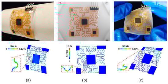 Mechanical simulation is performed using the commercial software ABAQUS. In the finite element method model, the shell element (S4R) is used for the Cu/PI lamination, and the hexahedron elements (C3D8R) is used in the Ecoflex. The Young’s modulus of PI and Cu are 2.5 GPa and 119 GPa, respectively, and their corresponding Poisson’s ratios are 0.34 and 0.34, respectively. Ecoflex uses the Mooney–Rivlin hyperelastic constitutive model with the parameters C10 = 0.048 MPa and C01 = −0.152 MPa. We simulated the adhesion process (device bending), biaxial stretching, and torsion scenarios, respectively, and determined that the principal strain distribution of the device under different scenarios.