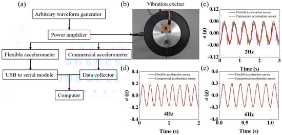 (a) Experimental setup for vibration tests, including arbitrary waveform generators, power amplifiers, flexible accelerometer, commercial accelerometer, USB to serial module, data collector, computer, and (b) vibration exciter. The Z−direction acceleration measurement data of the flexible accelerometer and commercial accelerometer at (c) 2 Hz, (d) 4 Hz, and (e) 6 Hz, respectively.
