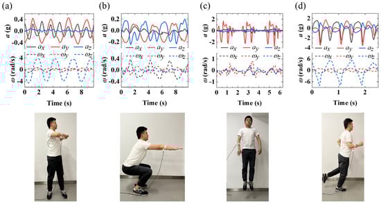 Real-time acceleration and axial angular of/around X-axis, Y-axis, and Z-axis direction during (a) arm twisting, (b) squatting, (c) jumping, (d) running.