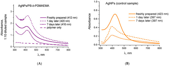 Figure 1A,B shows the UV–Vis spectra of the AgNPs formed in situ in the presence and in the absence of the PB-b-PDMAEMA diblock copolymer. As one can see, both samples, when freshly prepared, exhibit a characteristic surface plasmon resonance band at approximately 410–420 nm. While its position weakly depends on the presence or the absence of the copolymer, a considerable stabilization effect of the PB-b-PDMAEMA micelles is obvious. A spontaneous aggregation of non-stabilized AgNPs in the control sample results in a fast absorbance intensity decrease and broadening of the plasmonic peak soon after the preparation of AgNPs (Figure 1B). In solutions of the PB-b-PDMAEMA micelles, the plasmonic peak of the AgNPs keeps its position as well as its intensity (Figure 1A). One only notes certain (up and down) absorbance intensity variations for the metallopolymer hybrid system, which takes place during the first few days (Figure 1A). Afterwards, its absorbance demonstrates nearly no changes over at least 6 months (data not shown). The well-known strong stabilization effect of the PDMAEMA [38] is expected to impart such high colloidal stability to the AgNPs/PB-b-PDMAEMA metallopolymer hybrids. Apparently, the micellar structure of the PB-b-PDMAEMA diblock copolymer (Figure S1) could additionally contribute to the enhanced colloidal stability of the AgNPs/PB-b-PDMAEMA samples.