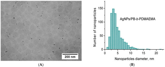 Keeping in mind that the molar ratio of N:Ag was set to 20:1 (see Section 2.2 for the conditions applied for the synthesis of the AgNPs), one can easily calculate the concentration of AgNPs in the AgNPs/PB-b-PDMAEMA system as 1.51 × 1017 particles/L (assuming a crystalline structure of the AgNPs) or 2.12 × 1017 particles/L (assuming a cluster structure of the AgNPs). Dividing these values by the concentration of the PB-b-PDMAEMA micelles (independently determined by means of nanoparticle tracking analysis as 3.7 × 1016 micelles/L [29]), one can further evaluate the mean number of the AgNPs per one micelle. Hence, one PB-b-PDMAEMA micelle apparently contains between 4 and 6 AgNPs. It is worth noting that these evaluations are in very good agreement with the analysis of the obtained TEM images (Figure 2A), wherein 5–6 AgNPs per one PB-b-PDMAEMA micelle were counted.