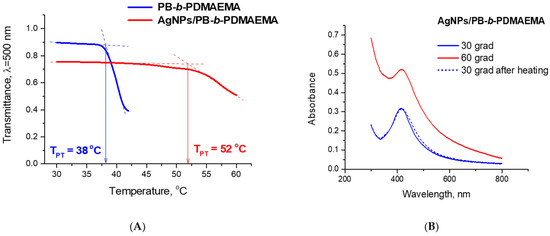 A thermoresponsive behavior of the PB-b-PDMAEMA micelles and the prepared AgNPs/PB-b-PDMAEMA metallopolymer hybrids was revealed in our work by means of turbidimetry. The measurements were performed for 0.2 g/L solutions of each sample at a heating rate of 0.4 °C/min. A temperature-induced hydrophobization of the PDMAEMA blocks and the subsequent aggregation of the PB-b-PDMAEMA micelles resulted in a change in the transmittance of the samples (Figure 3A). The inflection points in the transmittance–temperature curves, which correspond to the onset temperature of the transmittance decrease, are defined herein as the onset temperature of the phase transition TPT. As shown in Figure 3A, the transmittance curves demonstrate temperature-induced phase transition for both the PB-b-PDMAEMA micelles and for the AgNPs/PB-b-PDMAEMA metallopolymer hybrids, although the intensity of the process and the temperature ranges are remarkably different. Indeed, the TPT for the PB-b-PDMAEMA micelles was determined as 38 °C while the AgNPs/PB-b-PDMAEMA metallopolymer hybrids exhibit a higher TPT of 52 °C (Figure 3A). Moreover, the phase transition in the latter case looks considerably less sharp and less pronounced. Apparently, the loading of PDMAEMA blocks with the AgNPs notably suppresses the temperature-induced phase transition. Furthermore, Figure 3B clearly demonstrates that the phase transition for the AgNPs/PB-b-PDMAEMA metallopolymer hybrids is completely reversible (at least, within the examined temperature cycle of 30 °C–60 °C–30 °C).