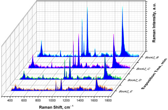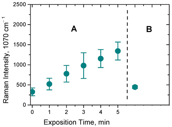 To prove whether the observed effect of the SERS intensity increase is due to a local laser exposure of the sample, a control experiment was performed, which started from recording the series of SERS spectra acquired in between five cycles of a 1 min laser exposure. Then, the laser was switched off, the drop of the sample was carefully mixed, and after that, one more SERS spectrum was recorded under the same conditions. As one can see from Figure 5, the intensity of the characteristic peak at 1070 cm−1 drops back to the initial value. Indeed, exchanging the exposed sample volume by a portion of the fresh sample via stirring leads to a decrease in the intensity of the SERS spectrum back to the start point, thus confirming that the local laser exposure plays a key role in the observed increase in the SERS signal.