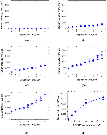 (A–E) The intensity increase in the 4-MPBA characteristic peak at 1070 cm−1 upon 8 cycles of local laser exposure of a drop of the AgNPs/PB-b-PDMAEMA hybrid labeled with 4-MPBA at different 4-MPBA concentrations (A) 0 μM (control with water), (B) 3 μM, (C) 6 μM, (D) 15 μM, and (E) 30 μM; (F) the dependence of the intensity of characteristic peak at 1070 cm−1 on 4-MPBA concentration plotted for the laser exposure time equal to 8 min. The data are presented as the mean ± SD for three independent experiments.