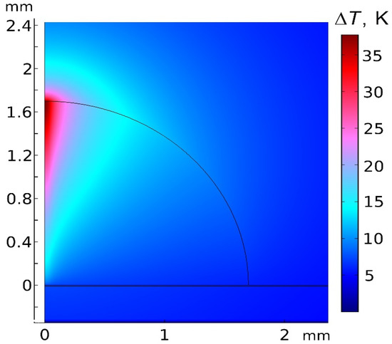 The simulated temperature increase distribution (with respect to the room temperature) resulting from laser heating in a sample drop (by a volume of 10 μL) on a foil and in the surrounding air (in the axisymmetric geometry). The horizontal direction corresponds to the radial coordinate (the symmetry axis is perpendicular to the foil plane and coincides with the laser beam axis).