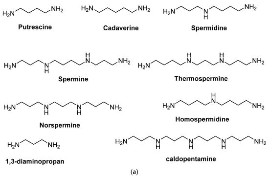 Polyamines (spermine, spermidine, and putrescine) consisting of two or more primary amino groups are aliphatic organic cationic compounds that are widely found in organisms (Figure 1) [1]. The homologs of polyamines (such as cadaverine, norspemine, homospemidine, and thermospermine) at lower concentrations play a less significant role [2]. The total number of polyamines found in living systems is on the millimole level, but the concentration of free polyamines is relatively even lower because cationic polyamines are usually bound to anionic nucleic acids, proteins or phospholipids, DNA, RNA, proteins, etc. [3].