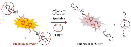 The water-soluble cucurbit[7]uril (CB[7]) was selected as a popular host because of its strong binding ability toward polyamines. The highly emissive “dumbbell-shape” supraamphiphiles, based on perylene diimides (compound 1) and CB[7], were utilized as a supramolecular sensor for the fast and ultra-sensitive detection of spermine [44]. Due to its high affinity with CB[7], spermine can preferably bind to CB[7] (binding constant K = 2.6 × 107 M−1), leading to the dissociation of the supra-amphiphiles and generating fluorescence quenching. The supraamphiphiles showed good selectivity for spermine over other structural analogs (spermidine, putrescine, L-arginine, L-lysine, etc.). This high sensitivity was maintained even in the presence of a low concentration of spermine (about 10 nM) (Figure 2).