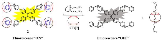 The cationic pyridyl functionalized compound 2 was an aggregation-induced-emissive (AIE) active dye, which was non-emissive in solution. Upon complexation with CB[7] via host–guest interaction, a fluorescent supramolecular system was formed [45]. The binding constant between 2 and CB[7] was found to be 3.77 × 104, 2.22 × 104, and 2.86 × 104 M−1 at a pH of 3.0, 7.0, and 10.0, respectively. Since the binding constant (2.6 × 107 M−1) between spermine and CB[7] was 1000-fold higher than 2-CB[7], 2 was released from the supramolecular system. The fluorescence at 537 nm was turned off. The detection limit of spermine was found to be 1.0 μM (Figure 3).