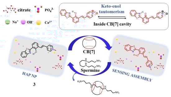 Bhosle et al. developed a three-component supramolecular sensing system containing a fluorescent compound, 3, CB[7], and hydroxyapatite nanoparticles (HAp NPs), which can be used to detect polyamines with high sensitivity [46]. In this case, compound 3 spontaneously interacted with HAp NPs by electrostatic interaction and with CB[7] via host–guest interaction. As a result, a three-component supramolecular system showed strong emissions at 615 nm (Figure 4). Spermine showed a higher binding ability to CB[7] than compound 3, leading to a higher binding constant (2.6 × 107 M−1 for spermine-CB[7] vs. 5.6 × 104 M−1 for 3-CB[7]). Upon the addition of polyamines, compound 3 was displaced from CB[7] and quenching fluorescence was observed. The low limits of detection of 1.4, 3.3, and 17.2 ppb for spermine, spermidine, and cadaverine were obtained, respectively.