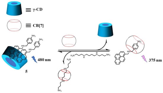 Yang’s group reported polyamine detection, based on pyrene excimer fluorescence, through the synergistic/competitive complexation among pyrene compounds (5), polyamines, γ-cyclodextrins (γ-CD), and CB[7] [51]. In this case, γ-CD accommodated compound 5 with binding constants of 5 × 106 M−1 for 1:2 binding modes, leading to the excimer emission of pyrene. Since a 1:1 host–guest complexation between 5 and CB[7] was identified, the addition of CB[7] yielded a decrease in the excimer fluorescence, accompanied by an increase in monomer fluorescence. On the other hand, polyamines can bind strongly to CB[7]. For example, spermine showed an association constant two orders higher of 1.28 × 106 M−1 than that of pyrene. The addition of urinary polyamines to a three-component supramolecular system (5, γ-CD, and CB[7]) competitively captured CB[7] and formed a complex of γ-CD-5 at 1:2 binding, enabling the recovery of the excimer fluorescence (Figure 6).