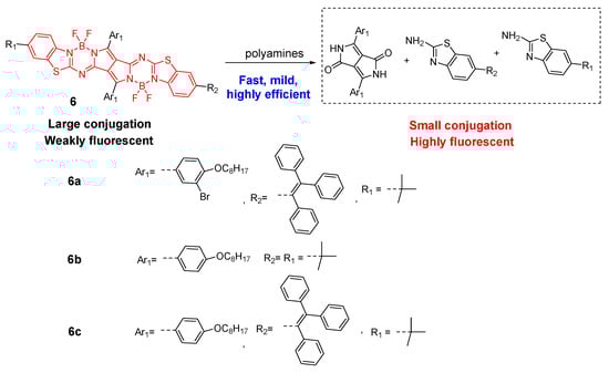 The chromophore-reaction-based fluorescent probes possess great advantages, such as a high selectivity to analytes and synchronous colorimetric and fluorescence changes [52,53,54,55,56,57]. Recently, we reported a series of pyrrolopyrrole aza-BODIPY (PPAB)-based fluorescent probes for polyamine detection, wherein the chromophore reaction-sensing mechanism was involved [58,59,60,61]. For instance, three PPAB dyes (4a4c) showed high selectivity and sensitivity toward polyamines by colorimetric changes from green to yellow and a fluorescent turn-on process [62]. There was a hypsochromic shift over 225 nm in the absorption maximum and a 12-fold fluorescence enhancement. The detection mechanism study revealed a B–N bond cleavage, and a transamination and hydrolysis reaction was involved that generated much smaller conjugated molecules. More interestingly, the limit of detection up to ppb level and the response time on the second timescale were demonstrated (Figure 7).