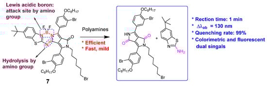 It is important to improve the reaction rate between fluorescent probes and polyamines. We designed and synthesized a lactam-fused aza-BODIPY (compound 7), which contained fewer cleaved imine and B–N functional groups [63]. The presence of spermidine and spermine induced an obvious color change from pink to yellow (130 nm hypsochromic shift of the absorption peak) and a 99% fluorescence “turn-off” response within 1 minute. Other amines failed to yield the same optical phenomenon. The high pseudo-first-order rate constants (kobs) of 15.67 × 10−3 S−1 and 8.99 × 10−3 S−1 for spermine and spermidine were present, respectively. A similar proposed sensing mechanism was involved through the B–N bond cleavage and hydrolysis reaction, to yield much smaller conjugated molecules (Figure 8).
