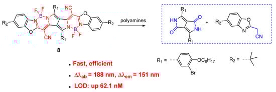 The aza-Michael addition reaction between α,β-unsaturated nitrile and primary amines can proceed smoothly under mild conditions. The pyrrolopyrrole cyanine dye (8) contained α,β-unsaturated nitrile as Michael acceptors, which was further appended with a withdrawing boron atom to enhance the aza-Michael addition reactivity [64]. Through this strategy, a highly efficient fluorescent polyamine probe was developed. Compound 8 showed 158-fold higher kobs with putrescine than compound 6a. As an efficient chromophore reaction-based probe for polyamine detection, the synergistic aza-Michael addition, B–N detachment, and hydrolysis reaction were involved between compound 8 and polyamines. The resulting low-conjugated product generated synchronous colorimetric and fluorescence changes (Δλab = 188 nm and Δλem = 151 nm). A limit of detection up to the 62.1 nM level for spermine was obtained (Figure 9).