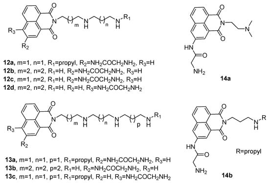 Figure 12. Chemical structures of the naphthalimide-polyamine conjugates, 12ad, 13ac and 14ab [74].