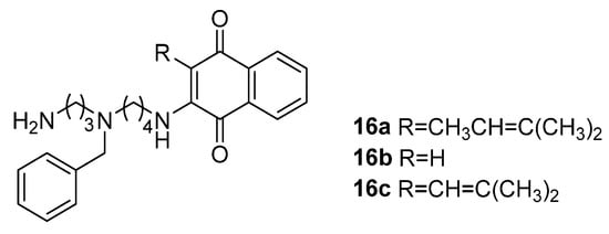 Figure 14. Chemical structures of the naphthoquinone-polyamine conjugates, 16a16c [81].