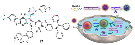 Our group explored a new type of PPAB-based photosensitizer (compound 17), which can cooperatively consume polyamine and produce two photosensitizers through an irreversible chemical reaction [95]. The combination of polyamine consumption and PDT by synergistically destroying tumor cells was a promising polyamine consumption strategy (Figure 17). Compound 17 had lysosomal targeting ability, ratiometric fluorescence imaging capability, polyamine depletion, and enhanced ROS generation. This study provides an irreversible polyamine consumption strategy, which improves anticancer efficacy after being combined with PDT.