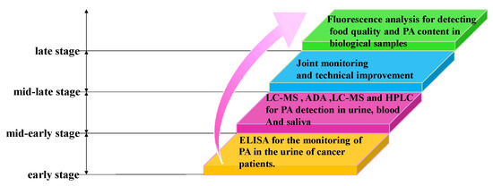 Recently, many novel sensing methods and materials have received additional attention. Enzymatic biosensors such as chemiluminescents, electrochemicals, and fluorescence have been developed for polyamine evaluation [98]. Cu2+—2-carboxymethylthio-5-mercapto-1,3,4-thiadiazole-functionalized organic thin-film transistors (OTFTs) exhibit the detection and discrimination of multi-polyamines [99]. The electrochemiluminescent (ECL) method was developed for the detection of several polyamines on a microfluidic chip [100]. An ultrahigh-performance supercritical fluid chromatography (UHPSFC) method was utilized for polyamine detection in gentamicin sulfate [101]. The in-situ high-performance chemical receptor-conjugated graphene electronic nose shows potential applications for polyamine detection [102]. Overall, more robust constitution techniques need to be developed to meet the requirements of polyamine determination. In the future, more advanced technology, including intelligent nanofilm biosensors, and multifunctional nanocomposite biosensors, would be a promising research field for polyamine detection.