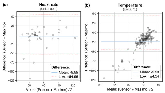 For HR, LoA ranged from ± 55 bpm, with a mean difference of 5.5 bpm. The WD consistently underestimated temperature with a mean difference of 2.3 °C on average, with LoA of ± 4.5 °C.