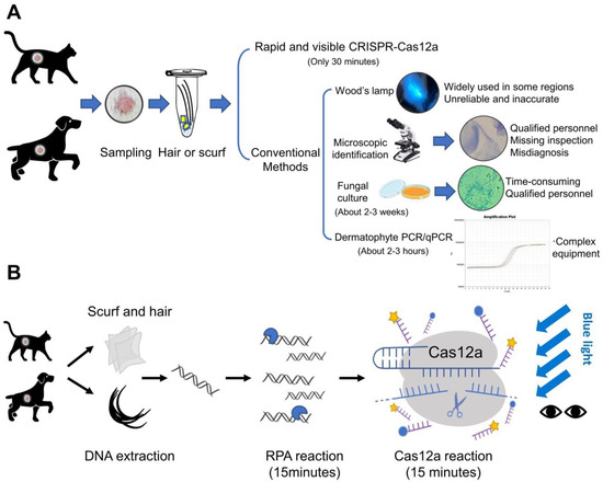 Schematic representation of diagnostic methods for dermatophytosis. (A) The methods of dermatophyte detection are summarized into two categories: The first category is CRISPR-Cas12a-based detection. It only takes 30 min after DNA extraction, with high specificity and sensitivity; The other is conventional detection methods including Wood’s lamp examination, microscopic identification, fungal culture and molecular detection methods (PCR and qPCR). (B) The Cas12a-based assay was performed in conjunction with recombinase polymerase amplification (RPA). After DNA extraction of scurf and hair samples, the tests are completed within 30 min. The results could be observed directly by naked eyes under blue light.