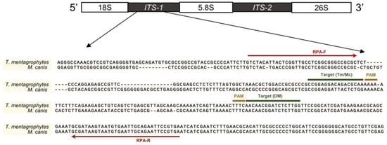 Because internal transcribed spacer (ITS) regions are considered the “gold standard” for identifying the fungi species, we designed the RPA-Cas12a assay by aligning the ITS sequences of M. canis and T. mentagrophytes (Figure 2). A common sequence was selected for crRNA guide recognition of dermatophytes (crRNA-DM) (this crRNA can also detect other dermatophytes, such as Nannizzia gypsea) and two specific sequences were selected for crRNA guide recognition of two main dermatophytes in cats and dogs: crRNA-Mc (M. canis) and crRNA-Tm (T. mentagrophytes) (Figure 2).