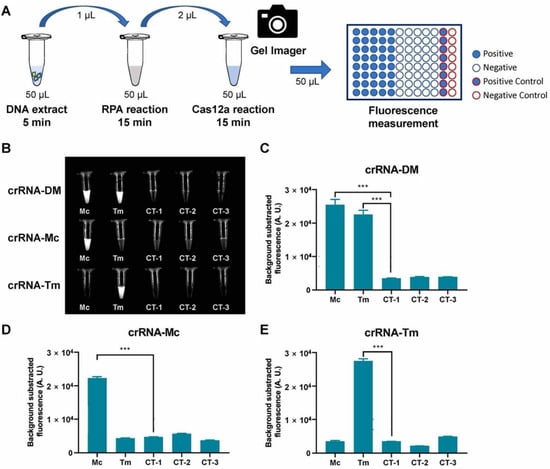To set up the detection assay, we carried out the RPA reaction using the DNA extract from two reference strains and three negative controls, then added the RPA products directly to the Cas12a fluorescence assay (Figure 3A). To examine the visual fluorescence signals using the same exposure time, we took a photo of all testing tubes under blue light using a gel imager (Figure 3B). The results showed that the crRNA-DM can detect two reference strains and two specific crRNAs can identify corresponding dermatophytes with obvious signals compared to control groups. To measure the fluorescence signals, three replicates of each Cas12a reaction were measured by the plate reader, and the results were consistent with the tube images by gel imager (Figure 3B–E). The fluorescence signals of the targeted samples are significantly different (p < 0.001) from negative controls and non-targeted samples.