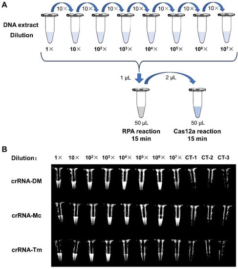 In order to determine the sensitivity of the RPA-Cas12a fluorescence reporting assays, we generated serial dilutions (1×, 101×, 102×, 103×, 104×, 105×, 106× and 107×) of the DNA extracts from reference strains and performed RPA-Cas12a fluorescence assays, respectively (Figure 4A). The imaging results showed that the fluorescence signals of crRNA-DM (1 to 106×), crRNA-Mc (1 to 107×), and crRNA-Tm (1 to 103×) were dramatically stronger than the negative control and can be distinguished by naked eyes under blue light (Figure 4B).